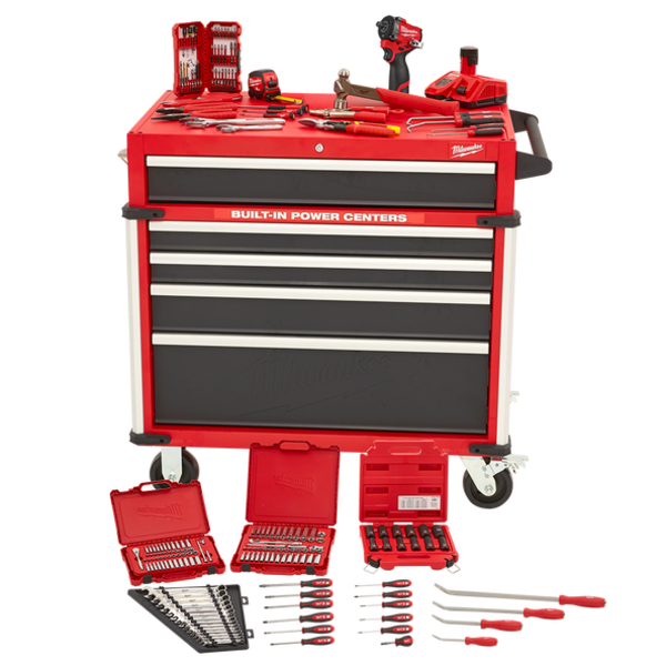 The Milwaukee® 238 Piece Automotive Starter Toolkit is a must-have kit for anyone starting out in the workshop. Your tools will be kept safe and secure in the 36" Steel Top Mobile Work Bench with its reinforced angle iron frame and 6” industrial casters, while its lockable 45kg soft close drawers, built-in power center, cable hooks and dedicated organiser provide you with the smooth accessibility and modern features required for everyday use. Includes premium laser cut EVA Drawer Foam, for quick and easy size identification and visibility for missing tools. Increase jobsite productivity with our M12™ Stubby Impact Wrench, which comes with two battery packs and a charger. The Milwaukee® 238 Piece 36" Automotive Starter Toolkit also comes with a large range of our innovative Impact rated Accesories and automotive Hand Tools, including ratchet and socket sets, wrench sets, screwdrivers, pliers, pry bars, hook and pick sets and more, so you are ready to tackle any challenge that comes your way.