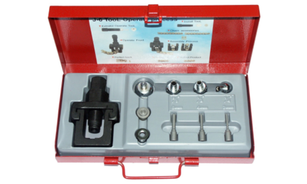 Set contains all the tooling required for cutting and disassembly of press fitted connecting links. Also for rivetting of the connecting pins and press fitting of the connecting pin plate. Full instructions are included.