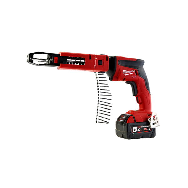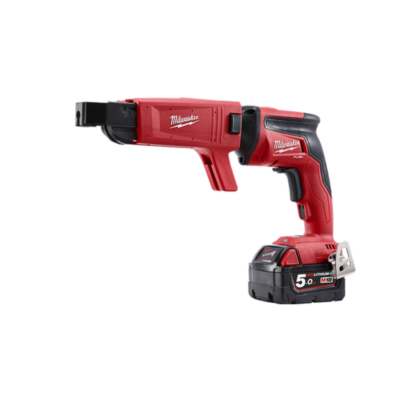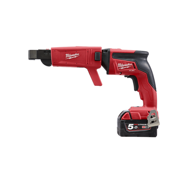 The M18 FUEL Drywall Screw Gun w/ Collated Attachment (M18FSGC-0) is faster than corded, features auto start functionality and delivers maximum runtime. The POWERSTATE Brushless motor spins at 4,500 RPM resulting in faster productivity. With REDLINK PLUS Intelligence, MILWAUKEE's auto start feature automatically starts the motor on contact with drywall providing less noise between screws and longer run time. REDLITHIUM™ 5.0Ah batteries (sold separately) power the M18FSGC-0 to deliver up to 64 sheets on one charge. The M18 FUEL Drywall Screw Gun w/ Collated Attachment delivers the balance and weight desired by professionals for all day use.