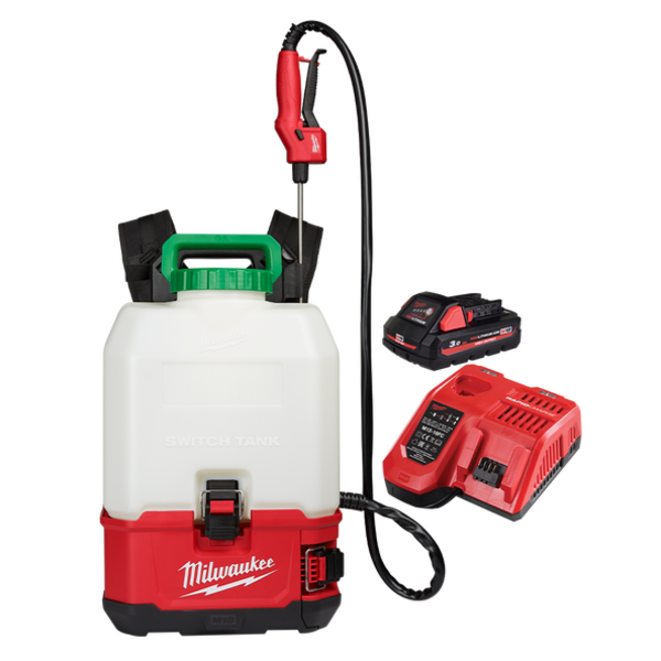 The M18™ SWITCH TANK™ 15 Litre Backpack Chemical Sprayer with Powered Base provides users an interchangeable tank design with no manual pumping. Designed to meet the needs of the landscape maintenance professional, the battery-powered backpack sprayer delivers instant, constant and adjustable pressure, up to 120 PSI, with up to 7.6 metre spray distance. The 5-speed pressure adjustment knob adjusts the pressure between 20 – 120 PSI for ultimate user control across a range of spraying applications. When paired with a M18™ REDLITHIUM™ HIGH OUTPUT™ 3.0Ah Battery, the chemical sprayer provides users with up to 12 tanks of spray delivery per charge. The 15 Litre Chemical Sprayer Tank Assembly features a dual diaphragm pump for increased durability and maximum pump life, while Viton® seals increase durability against harsh chemicals. The tank also has a wide mouth opening for easy pouring and a strainer that filters out debris from entering the tank. The backpack frame includes wide straps and a handle for convenient transportation and storage. The 15 Litre Chemical Sprayer is comprised of two components – the SWITCH TANK™ Powered Base and the SWITCH TANK™ 15 Litre Chemical Sprayer Tank Assembly. The Powered Base includes the motor, battery compartment and REDLINK™ PLUS intelligence, while the interchangeable Tank Assembly includes the pump, hose, and wand. The isolated pump, hose and wand design allows users to add on tank assemblies for different spraying applications, eliminating cross-chemical contamination. It also provides users the ability to replace the tank assembly at a lower cost of ownership compared to replacing the entire sprayer unit. The Powered Base is also compatible with the 15 Litre Water Supply Tank Assembly (491628WSA).
