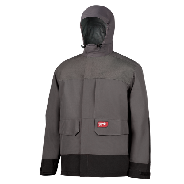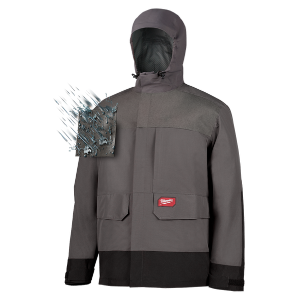 The HYDROBREAK™ Rain Shell is designed to stand up to the harshest rain conditions on and off the job site. The 2.5 layer rain shell jacket is built from ripstop polyester, polyurethane laminate, and a printed pattern. HYDROBREAK™ provides you with 10k mm rated waterproof job site protection while remaining compressible and lightweight, providing you with improved mobility and comfort. The waterproof rain shell can serve as an outer layer to the M12 AXIS™ Heated Jacket to complete the M12 AXIS™ Heated Layering System to protect you from extreme rain and cold conditions.