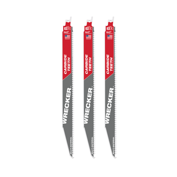 The Milwaukee WRECKER™ with Carbide Teeth SAWZALL™ Blades are the most versatile carbide blade on the market. These multi-material SAWZALL™ blades offer up to 50X more life vs. bi-metal reciprocating saw blades. The Milwaukee WRECKER™ Carbide SAWZALL™ blades offers a 6 TPI design, which allows for cutting into a wide variety of materials from clean wood to cast iron for quick demolition and remodeling work. The Fang Tip™ Design allows for faster plunge cuts into wood materials. Milwaukee Carbide Teeth products allow you to cut longer, cut more, and cut faster than other carbide teeth blades on the market.