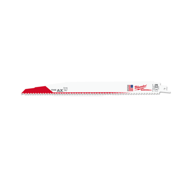 The AX™ SAWZALL™ blades have been engineered to deliver the fastest cuts, longest life, greatest tooth durability and quickest plunge cuts of any wood demolition blade on the market. The AX™ SAWZALL™ Blade features a NAIL GUARD tooth design to prevent nails from fracturing the blade’s teeth upon impact and an aggressive 5TPI design to deliver fast cuts. While ordinary plunge tooth designs can bounce or skate along the work surface, the FANG TIP design bites into the wood on first contact to make the cut virtually effortless. A pair of unique, fang-like teeth and an extra-large gullet deliver plunge cuts with ease. The combination of these features will allow users to cut through a wide range of standard and abrasive materials without sacrificing the life of their blade.